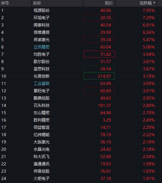 09:42 早盘消费电子板块震荡走强,苹果产业链方向领涨,矩子科技涨超 10%,信维通信、立讯精密、歌尔股份、环旭电子、蓝思科技涨幅靠前。