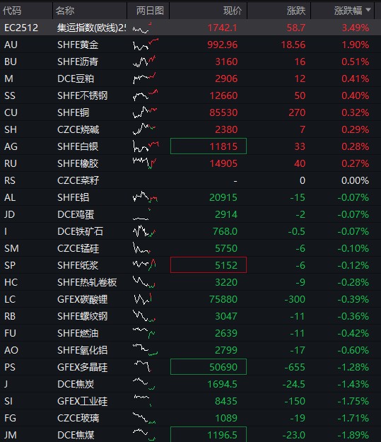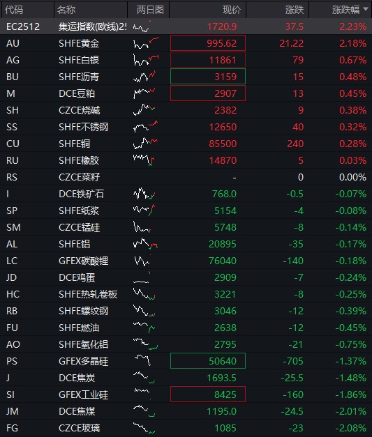 盘面上,科网股延续反弹势头,舜宇光学科技、阿里巴巴涨 3%;黄金等有色行业跟随期货市场反弹,赤峰黄金涨 4%;宁德时代高开近 3%,第三季度净利润同比增逾 4 成。 09:01 商品期货开盘,沪金主力合约涨超 2%,沪银、集运欧线涨超 1%。焦煤、多晶硅、焦炭、纯碱跌超 2%,玻璃、甲醇、乙二醇跌超 1%。